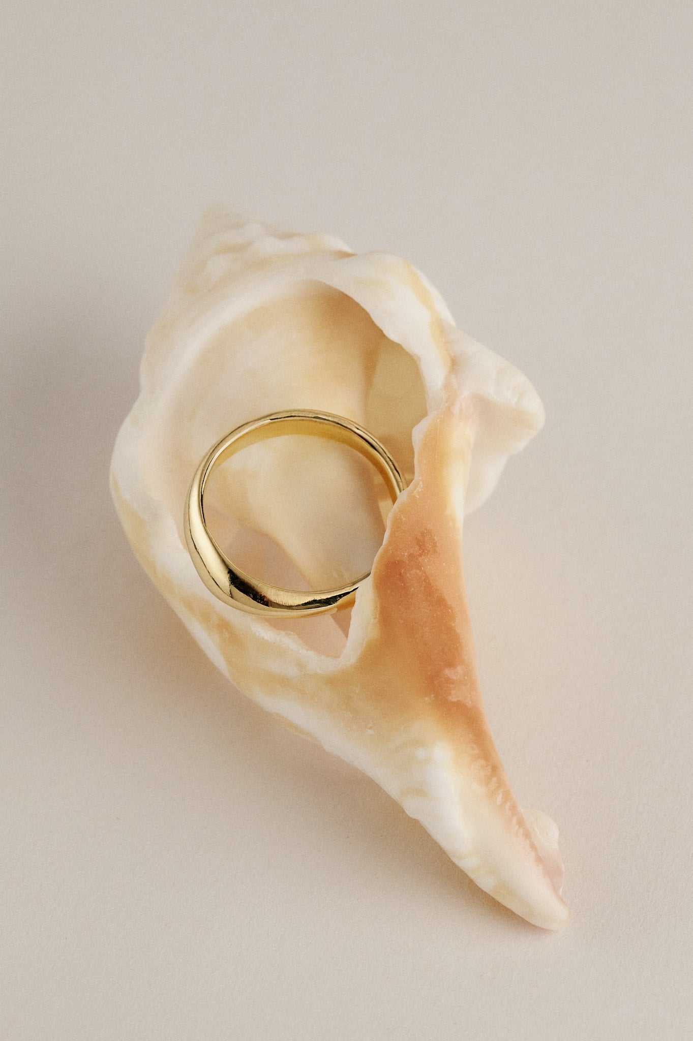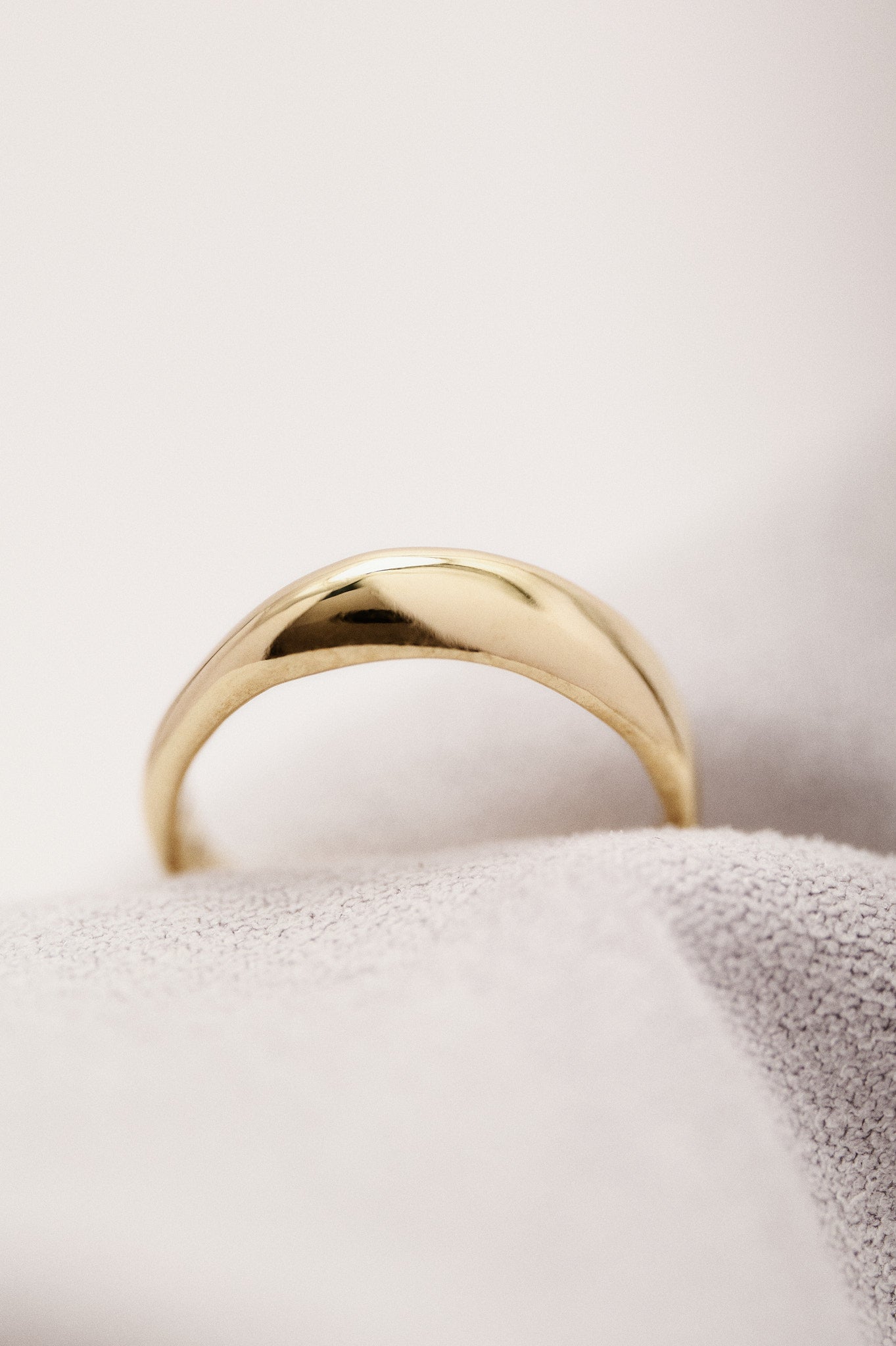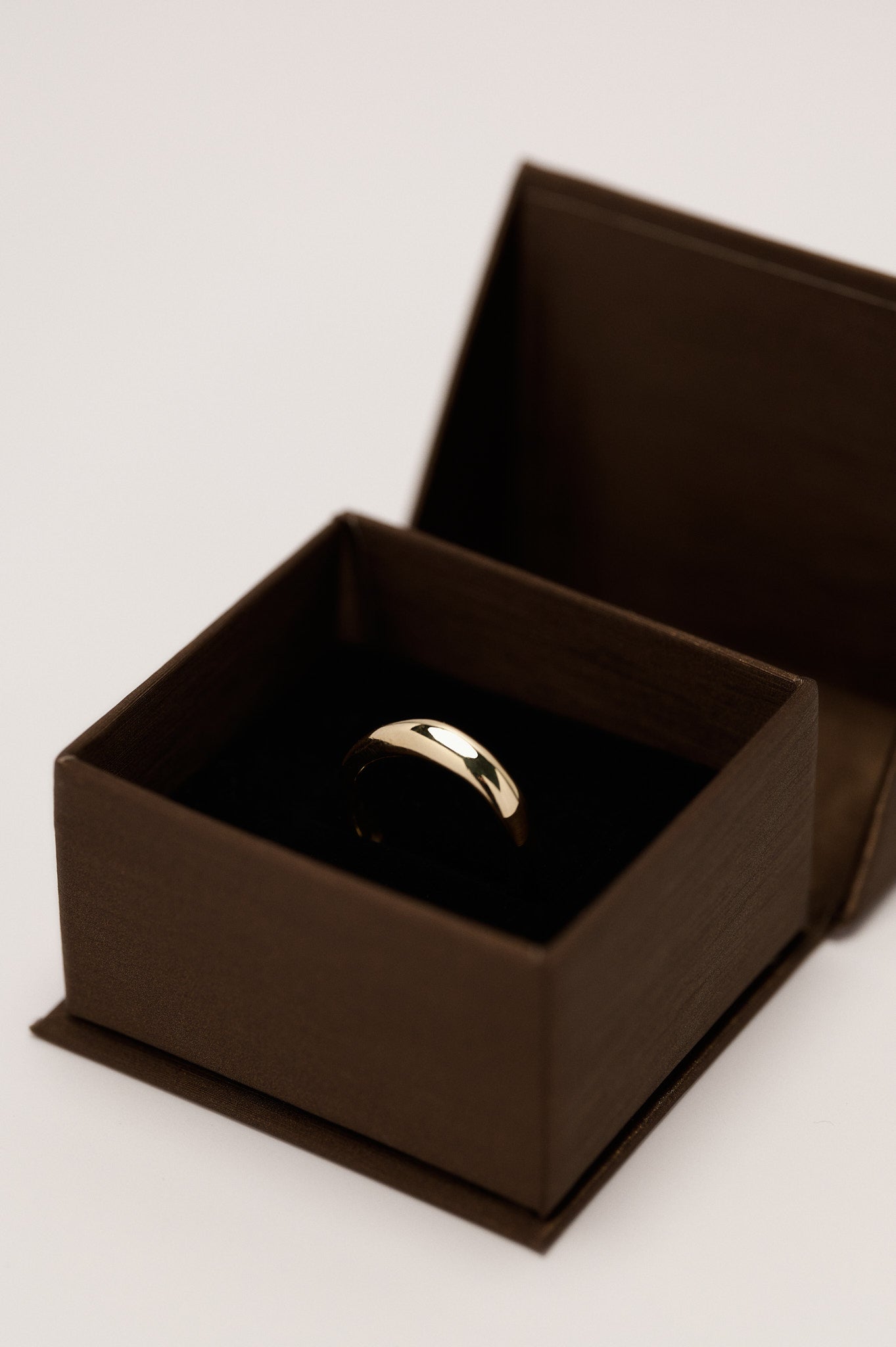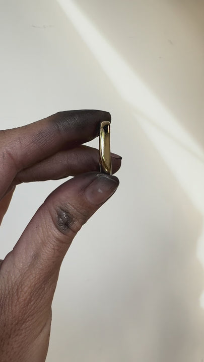 This 14 karat gold band was carved to look classic and traditional at first glance especially on the top down plan view. But as it moves, its shape subtly changes-curves appear, angles soften, and the form feels more personal.