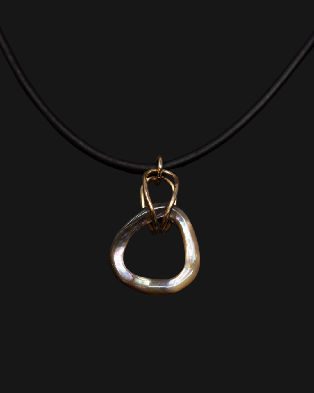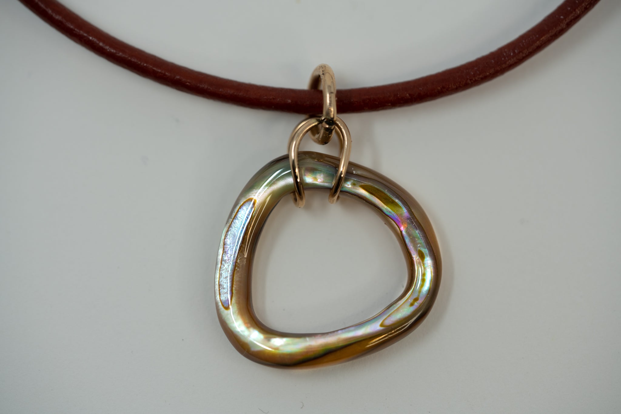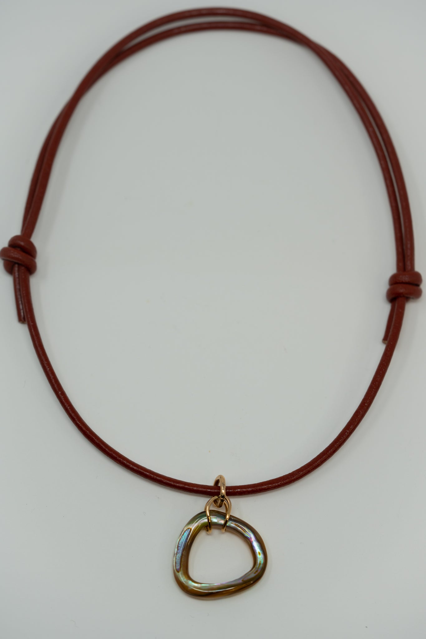 The Nyra pendant features a stunning black lipped abalone, also known as black mother of pearl, expertly carved into an organic disc shape. Suspended from a 14-karat gold bail, it hangs gracefully on a sleek black or red leather cord. This piece combines natural materials and fine metals making it a sophisticated peice for those who appreciate sleek and rustic.