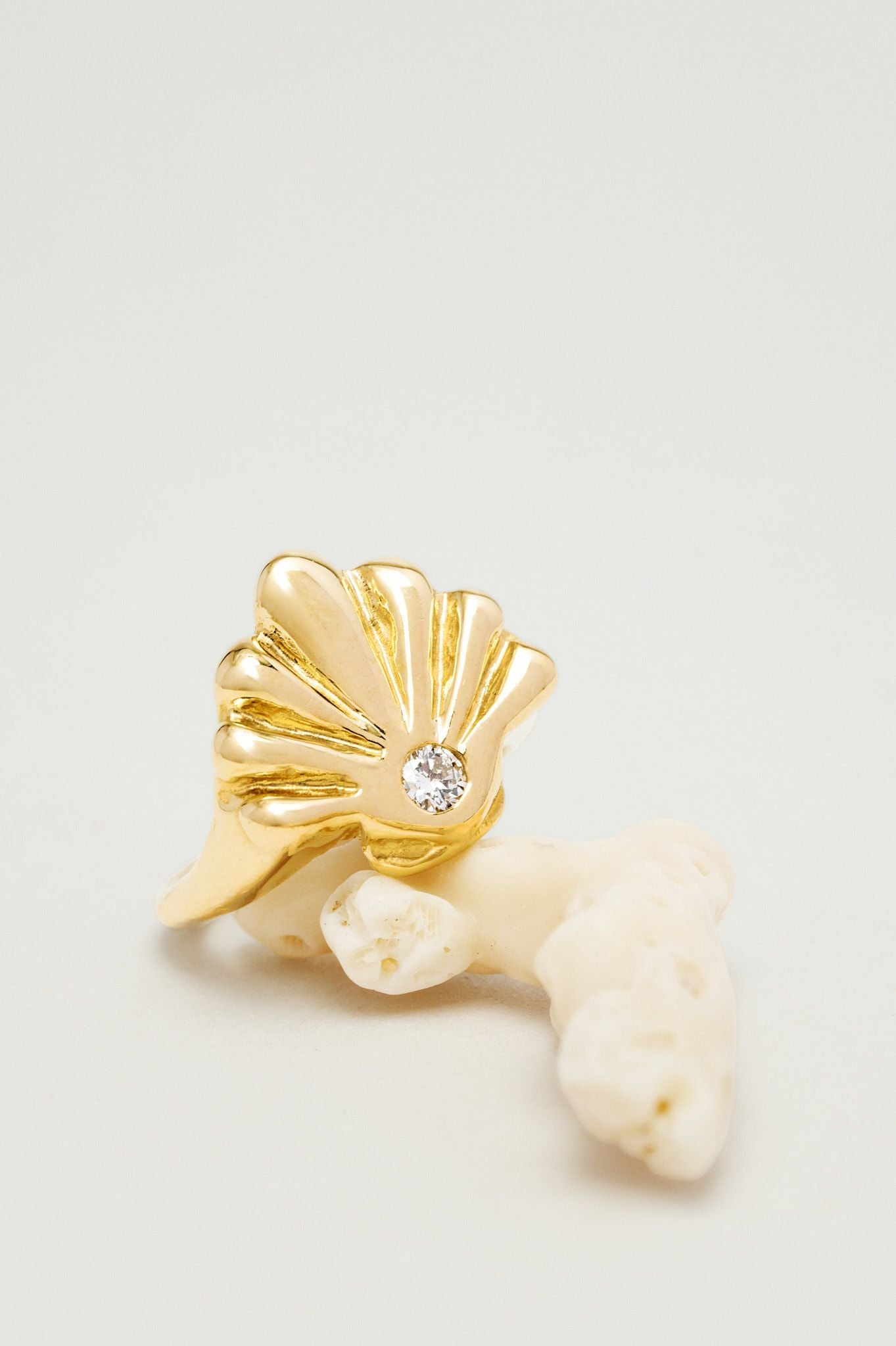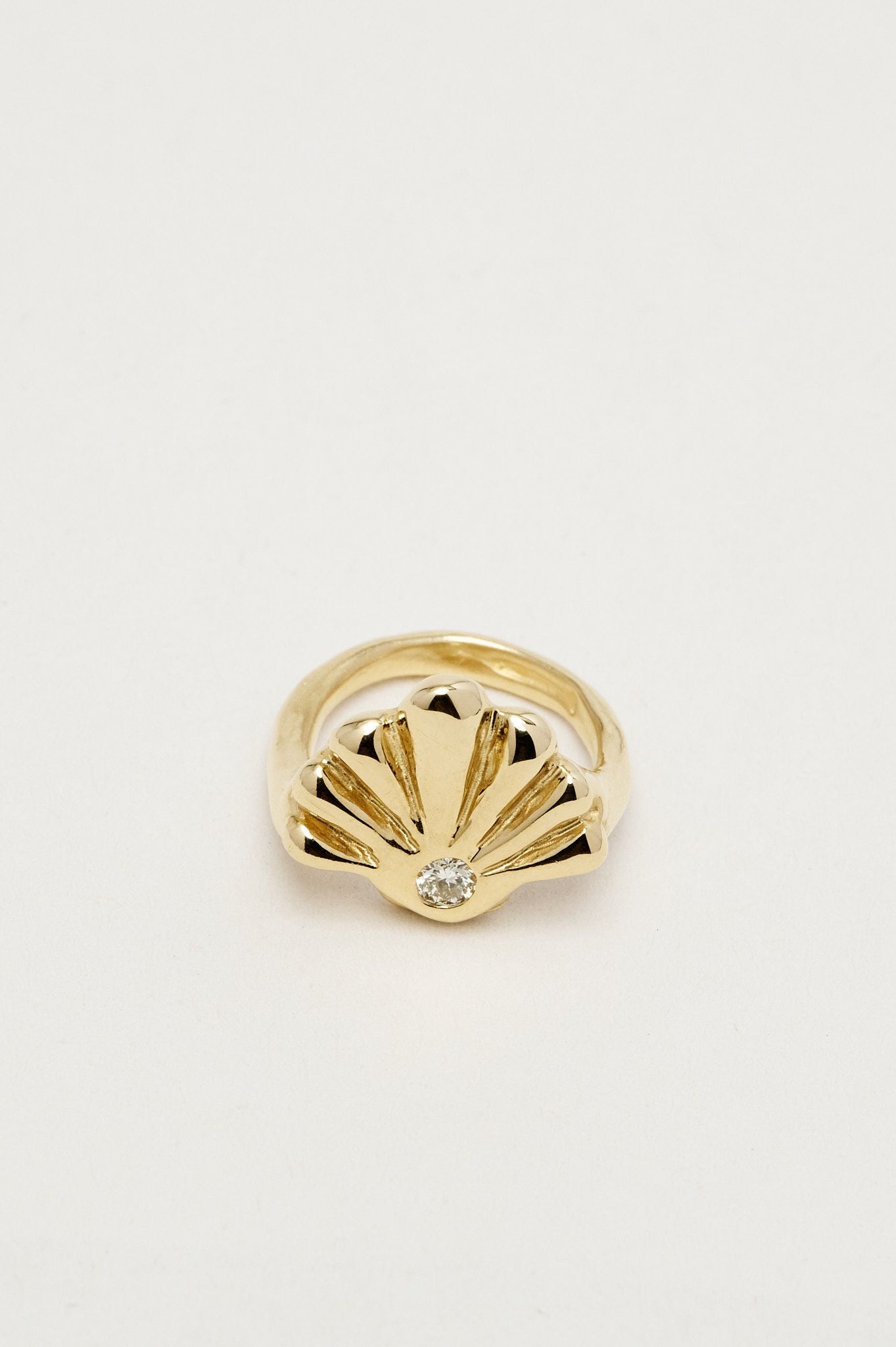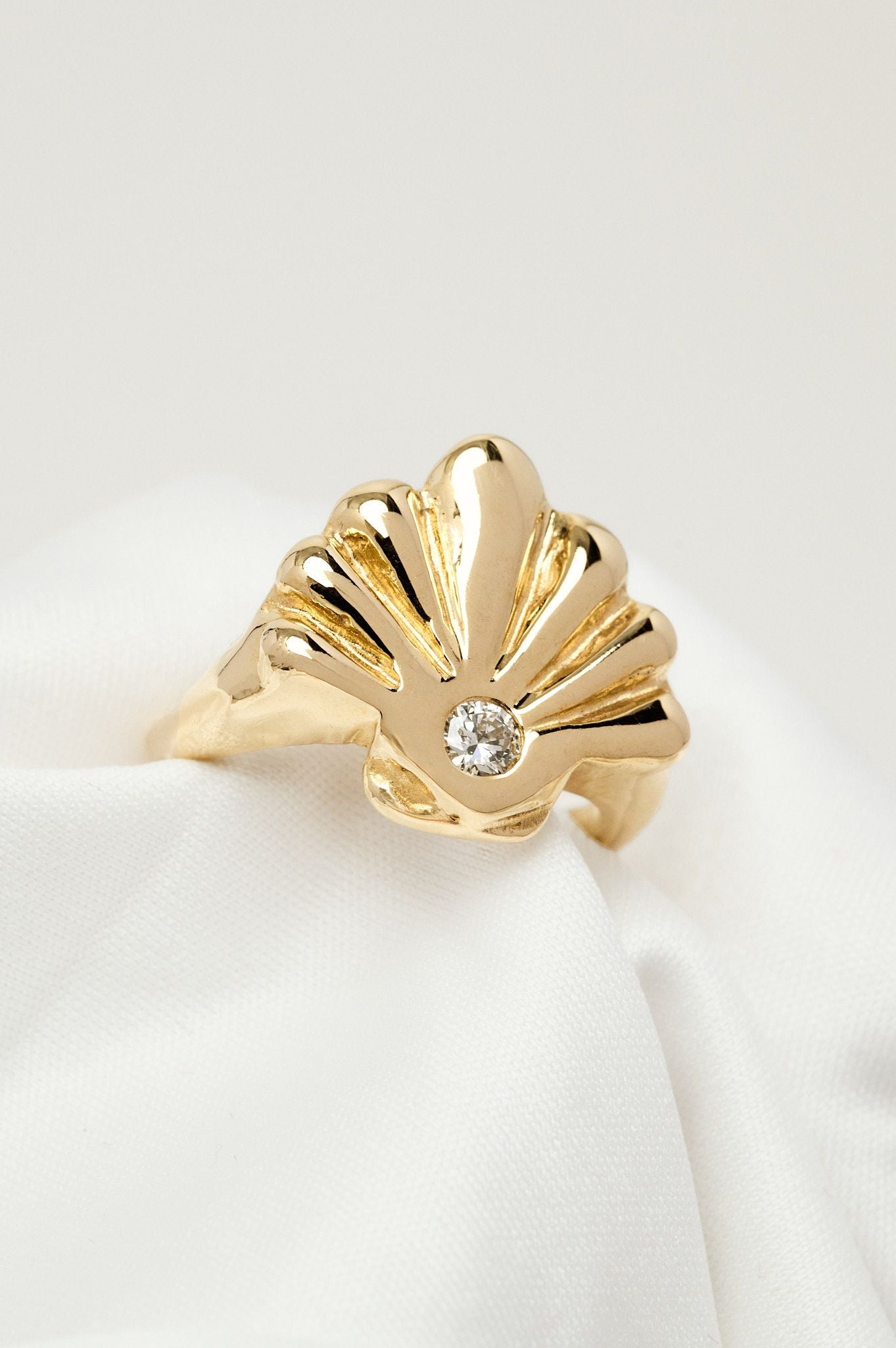 14 karat heavy gold hand carved ring with four point VS white round brilliant diamond. This bespoke ring showcases a classical scallop shell design. Sized to suite and made to order.