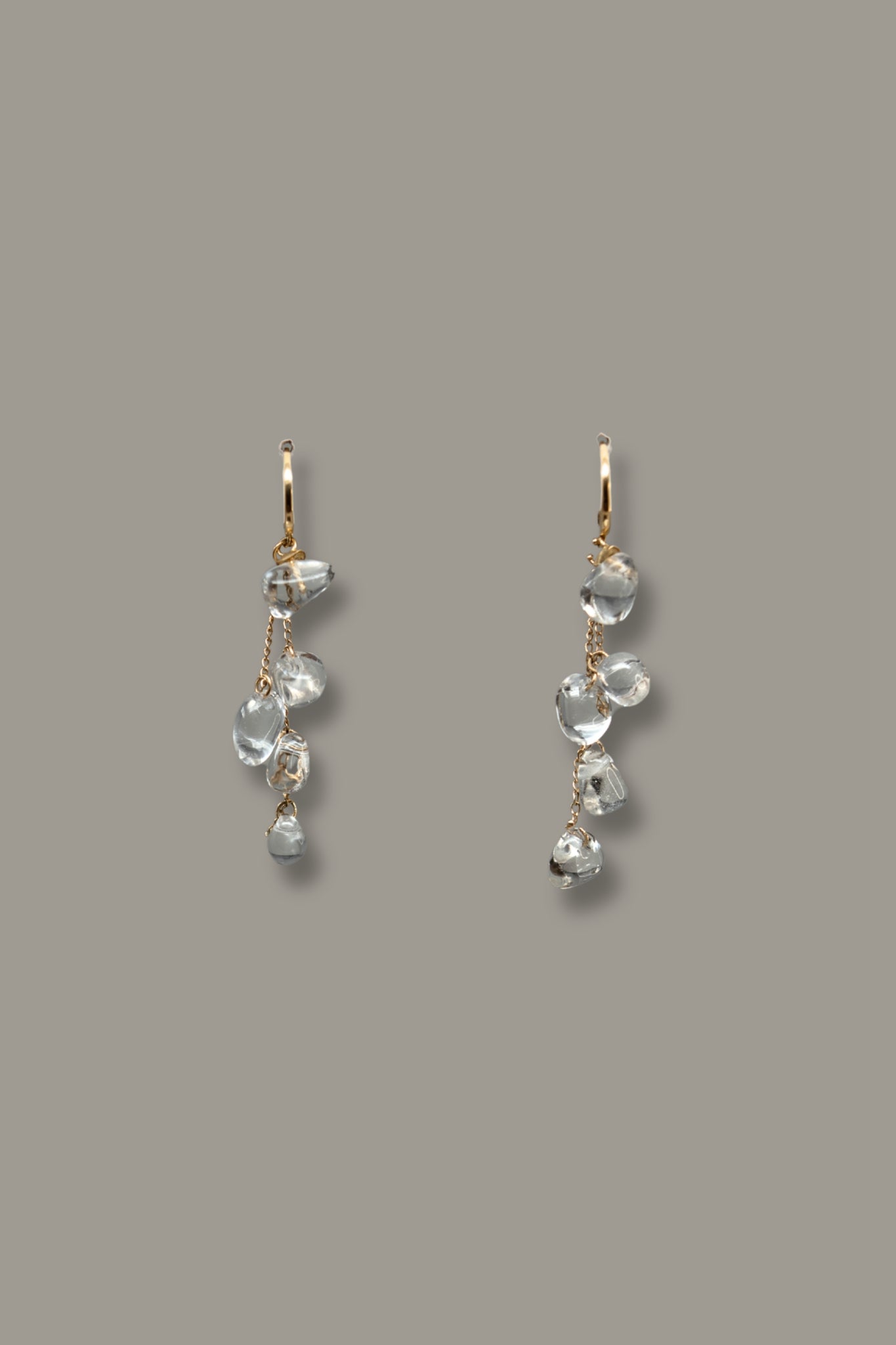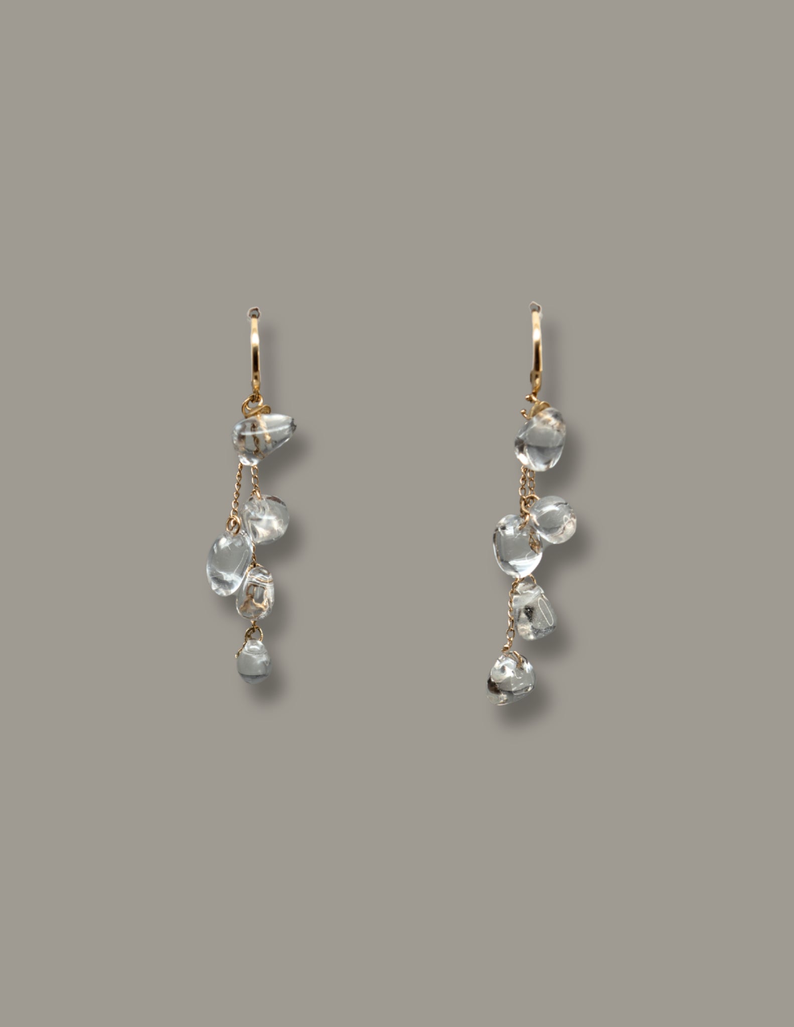 14 karat solid gold super fine chain and huggie clicker hoops with AAA grade crystal clear quartz droplets